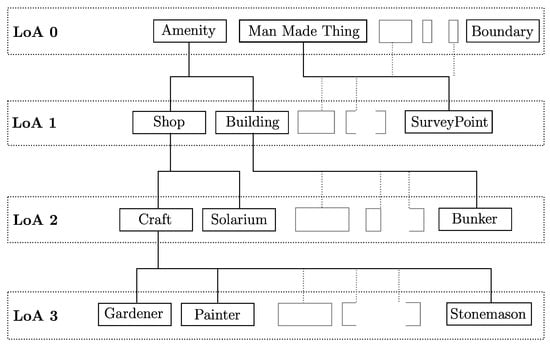 In Experiment two, the aim was to explore the influence a varying level of knowledge on the semantics has on the LULC classification. For example, how does the model performance change once there are only 50 OWL classes available describing geo-object types, versus, when all 1300 OWL classes are available? The OWL ontology describes these classes, such as BeautyShop or Amenity, respectively (see Figure 5 for examples and visualization). These OWL classes exhibit sub- and super-class relationships to each other. Please note, the OWL classes were not defined by us, but by LinkedGeoData []. We denote the level of knowledge, which describes different granularities of semantics, as the the level of abstraction (LoA). The LoA descibes the levels in the lattice-like structured OWL ontology, and we define it as the maximum number of super-classes an OWL class has. The top layer of this OWL lattice structure contains the most abstract geo-object types (i.e., OWL-classes such as Amenity or Boundary). We denote this layer LoA 0 as it is the first layer. The least abstract geo-objects (e.g., Gardener, Beekeeper, etc. in Figure 5) are in the last (the fourth) layer which we denote LoA 3. The LoAs between are denoted LoA 1 and LoA 2. LoA 1 contains more abstract classes than LoA 2. Thus, there are four levels of abstraction. In Experiment two, these four LoAs were used to parametrize the detail of knowledge on geo-objects. They were pruned one by one and the LULC was then re-run based on the pruned dataset (using the model and encoding from Experiment one which scored the highest classification accuracy). Three pruned datasets were created: (I) OWL classes of LoA 3 were pruned (denoted L.0–2); (II) OWL classes of LoA 3 and 2 were pruned (denoted L.0–1); (III) OWL classes of LoA 3 to 1 were pruned (denoted L.0). Not all geo-objects belong to LoA 3, 2 or 1 (and therefore to all other LoAs); however, they at least belong to LoA0. A geo-object may, for example, be of type Shop and an Amenity only. As such, this pruning strategy ensured that no geo-object was lost in a dataset, but only OWL-class information was removed (due to its super- and sub-class relationship). For example, a PetShop is always also a Shop and Amenity. Therefore, no information loss (or gain) was due to missing geographic information. Once the model was re-run on each of the pruned datasets, their classification performance was measured with the same metrics as in Experiment one.