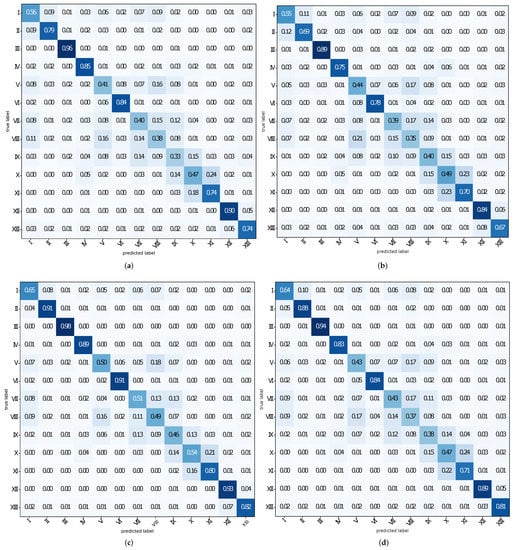 The confusion matrices of the four encoding in Experiment one: (a) GSCM; (b) LGSCM; (c) GSCM; (d) CUBE. Please note that in Experiment one all available OWL classes (all LoAs) were used. The horizontal and vertical axis indicates predicted vs.true labels, respectively.