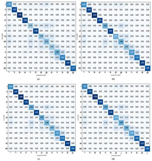 The confusion matrices (see Figure 7a–d) confirm prior observations of the overall classification performance. For example, the confusions among the LULC classes also decrease here the most when increasing LoA 0 to LoA 0 and 1 (see Figure 7a,b), respectively). Increasing to LoA 2 and LoA 3 (see Figure 7c,d), respectively) but with a lower magnitude also confuses. Here, some minor changes in confusions with LULC classes X, XI and class I can be observed when including LoA 3.