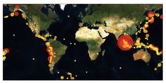 A plot of all the earthquake events with magnitudes larger than Mw 6.8 spread on a global map, taken from our earthquakes dataset. The radius and the color of each earthquake are consistent to the magnitude–yellow corresponds to earthquakes in the range of Mw 6.8–7, orange corresponds to earthquakes in the range of Mw 7–7.9, and red for earthquakes ≥Mw 7.9.