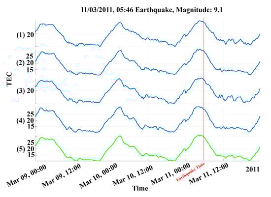 An example of the epicenter time series generation process applied with a 9.1 magnitude earthquake that occurred on 3 November 2011, at 05:46 UTC, where (1–4) are the time series’ of the four nearest points to the epicenter on the map, and (5) is the resulting weighted average time series; the red line is the time of the earthquake.