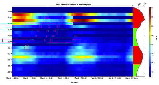 Figure 6 shows an example of the TEC time series data around 11 March from 1999–2020. Using our quiet days definition described above, we found 15 candidate days, where the monthly mean SSN number exceeded 50 SSN, and from which we randomly picked one for each training set. Figure 7 shows an example of a randomly picked normalized quiet day (March 2013) compared with the 11 March 2011 Tōhoku earthquake day, which was also normalized by subtracting the minimum TEC time series value from the original time series and then dividing it by its maximum value.