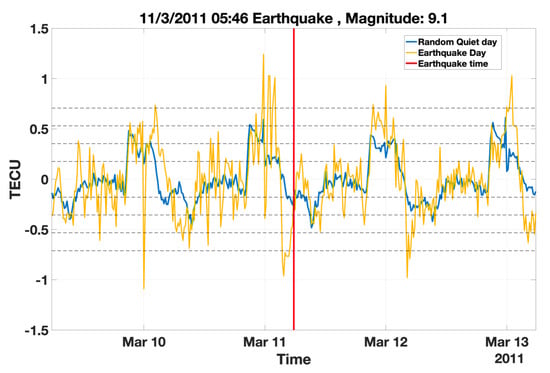 An example of a randomly picked normalized quiet day (3 November 2013) from the quiet days corresponding to the 9.1 Tōhoku earthquake that occurred on 3 November 2011. As can be seen, within a two days time window (before the earthquake event), the normalized ionospheric TEC values exceeded four times the standard deviation of the randomly chosen normalized quiet day.