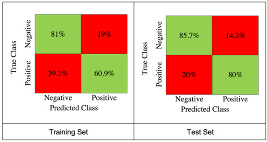 The confusion matrix for the SVM model results extracted from the training set (left), and the test set (right).