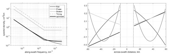 where p enumerates the four GOE components associated with uncertainties in the roll, phase, baseline length and timing of the on-board interferometer, ⊗ denotes the tensor product, , are the respective across-swath covariance matrices, are the along-swath power spectra shown in the left panel of Figure 1, and , denote, respectively, the Fourier transformation matrix in the along-swath direction and its inverse.