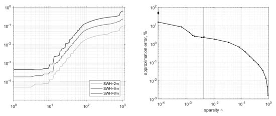 (Left) Eigenvalues of the expansion matrix in Equation (10) computed for three different values of SWH field at 2 km resolution. (Right) Dependence of the precision matrix approximation error on the fraction of non-zero elements in a matrix. Consecutive (from left to right) dots along the graph correspond to two-time reduction of the threshold value eliminating small matrix elements to obtain an approximation. Thin vertical line corresponds to sparsity of the block-diagonal approximation. Diamond and asterisk mark approximation errors obtained, respectively, by inverting the diagonal of , and keeping only block-diagonal elements of the precision matrix.