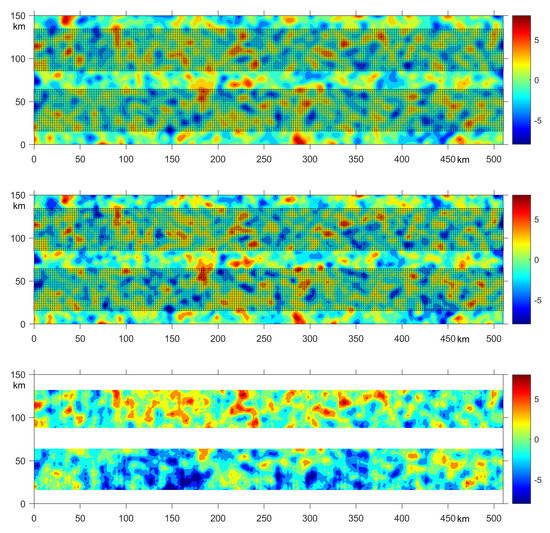where is the normally distributed 2d field, and , are the square roots of the background (14) and SWOT (2) error covariances. Two realizations of the “modelled” and “observed” fields are shown in the middle and bottom panels of Figure 3.