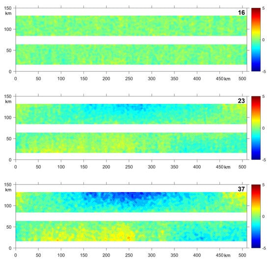 The analytical analysis of precision matrix and its square root indicate that their block-diagonal approximations are more accurate for retrieval of the SSH structures with typical wavelengths below the swath half-width (scales less than 20 km). This makes the proposed approximation technique especially suitable for multi-scale data assimilation (e.g., [18,19]) at its final stage, after correction of the larger-scale (mesoscale) structures of the model state. Furthermore, since the typical magnitude of SSH perturbations at submesoscale (2–4 cm, [20]) is comparable to (and often less than) SWOT errors [4], statistically consistent treatment of the spatial structure of the observation error covariances becomes especially important in the analysis and assimilation of the SWOT data at the wavelengths below 50 km. Comparison of the analysis error fields (shown in middle and bottom panels of Figure 4) provides a particular demonstration of the necessity to properly take into account spatial correlations of the observational errors within the swath.