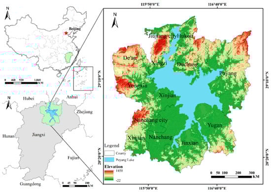 The PYL area is located on the south bank of the middle and lower reaches of the Yangtze River and north of Jiangxi Province (28°10′–29°51′N, 115°23′–117°45′E). The study area includes 12 counties and urban areas in Jiujiang, Nanchang, and Shangrao cities (Figure 2). The area has a subtropical humid monsoon climate, with an annual average temperature of 16–20 °C, abundant rainfall, a long frost-free period, four distinct seasons, and small temperature fluctuation with few high-temperature days [49]. The western and northern parts of the PYL area are dominated by mountains and hills, and the central area around the lake is low and flat and dominated by plains. The water system is centered on Poyang Lake. Five major rivers of Xinjiang, Fuhe, Ganjiang, Raohe, and Xiuhe flow into Poyang Lake, which is the largest freshwater lake in China and an ecologically important area in China, and an important base for food, oil, cotton, and fish in the middle reaches of the Yangtze River [50].