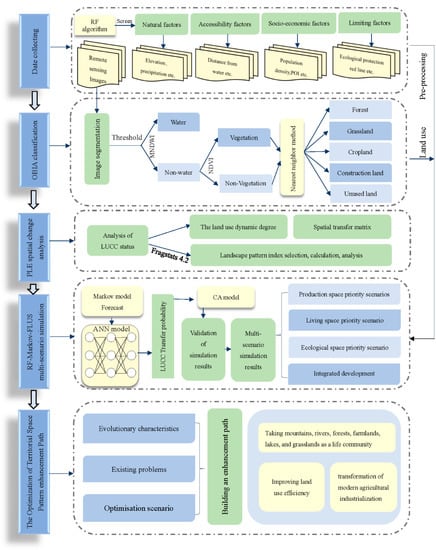 In this study, the multi-time Landsat series remote sensing images were preprocessed in the ENVI5.3 platform and interpreted by the OBIA method with the help of the eCognition Developer 64 platform, and the land-use types of the study area were classified into cropland, forest, grassland, construction land, water, and unused land according to the classification method of third-round national land inquisition and the purpose of the study.