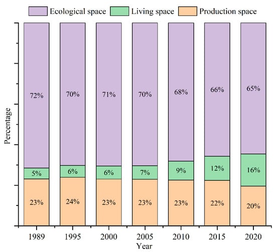 This paper used the dynamic degree to measure the net rate of land-use change [61]. Spatial-temporal changes in PLE in the PYL area were compared and analyzed (Table 4, Figure 4), and the results showed that the largest percentage of ecological space in the national land area was 69% on average per year during 1989–2020, followed by production space and living space, with 23% and 9% on average per year, respectively. During the study period, living space had the highest dynamic degree of 2.14%, which increased by 2144.72 km2 with the largest growth rate.