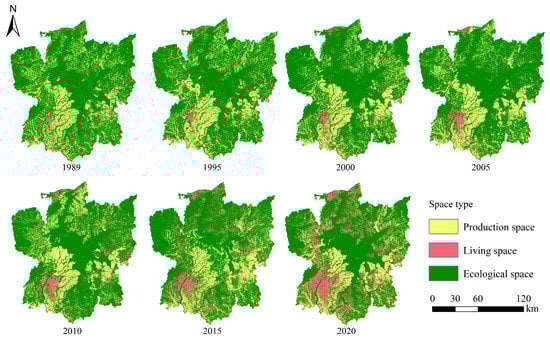 - From 1989 to 2020, the production and ecological space areas in the study area both declined, by 717.9 and 1414.19 km2, respectively. Living space expanded from the center to the periphery with the fastest growth rate, with an area increase of 2144.72 km2, mainly dominated by the urban areas of Nanchang City and Jiujiang City, indicating the continuous expansion of urban living space.