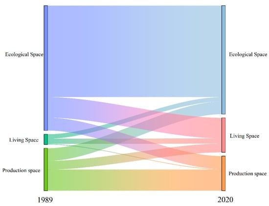 A transfer matrix represents the transformation of each type of site from the beginning to the end of the study [61]. This study used the ENVI5.3 platform to calculate the transfer matrix results from 1989 to 2020. The results are shown in Table 5 and Figure 6. During the study period, PLE space in the PYL area was dominated by a transfer out of ecological space and a transfer in of living space.
