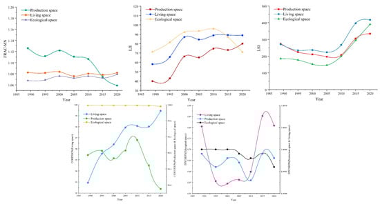 - The LSI index reflects the irregularity of landscape patches. During the study period, the production, living, and ecological space areas all increased, and for all of them, 2005 and 2010 were turning points for growth rate increases. The most significant change occurred in ecological space, which indicated that under the influence of human activities, the landscape regularity change was hindered, and fragmentation occurred.