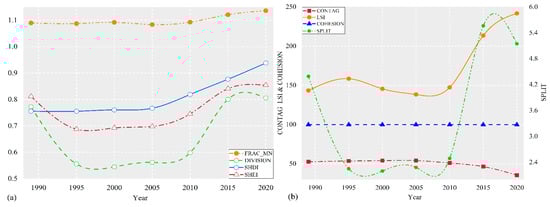 The analysis of landscape pattern dynamics is a focal area of landscape ecology research. The shape, size, number, and spatial combination of landscape patches reflect the intensity of human activities, the degree of economic development, land-use level, and other characteristics [58]. Analysis of the landscape index can reflect changes in landscape patterns, quantitative indicators of the landscape structural composition, and spatial configuration characteristics [59]. Based on the relevant literature and the current situation of the study area, the following landscape pattern indices in the class/landscape metrics were selected for this study: the Mean Fractal Index Distribution (FRAC_MN), Interspersion and Juxtaposition Index (IJI), the Landscape Shape Index (LSI), the Landscape Division Index (DIVISION), the Cohesion of Patches Index (COHESION), the Contagion Index (CONTAG), the Shannon Diversity Index (SHDI), the Shannon Evenness Index (SHEI), and the SPLIT Index. Table 3 contains each landscape index and its ecological significance.