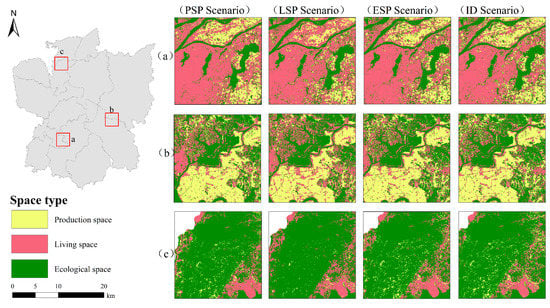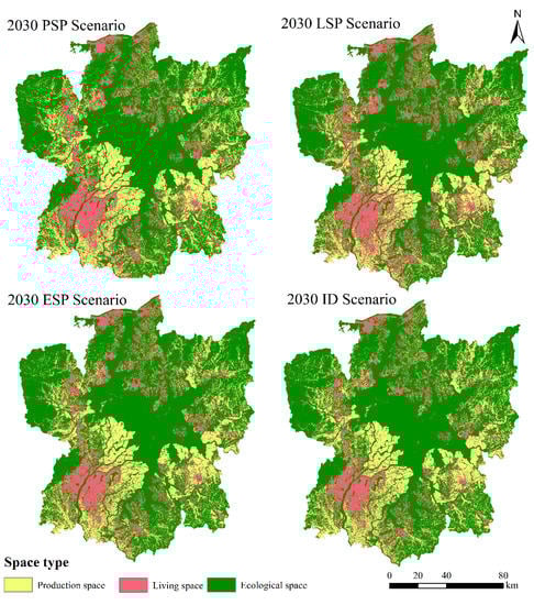 - According to the four scenario simulation results in 2030, production, living, and ecological spaces can be developed and protected to the greatest extent in the PSP, LSP, and ESP scenarios, respectively, but the ID scenario can more scientifically and reasonably lay out the spatial pattern of production, living, and ecology, realizing multiple functions of production, living, and ecology.