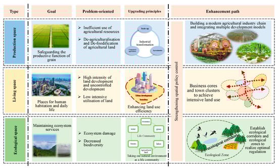 Improvement in the function of territorial space requires a combination of problem and goal orientation. According to the territorial spatial positioning and the problems faced by development, the three aspects of agricultural industry transformation, improving the efficiency of urban land use, and creating communities of “mountains, water, forests, fields, lakes and grass” were addressed to alleviate inefficient use of arable land, sloppy use of urban space, fragile ecology, and human damage, and to establish a framework for upgrading the path (Figure 11).