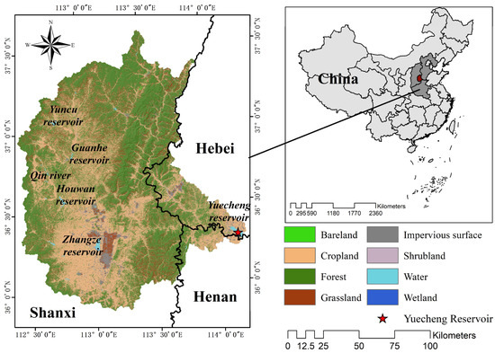 Yuecheng Reservoir is located in Ci County, Handan City, Hebei Province, China. It is a national super-large reservoir that serves as an urban water supply; it integrates flood control, irrigation, power generation, and other functions. It is an important water source for Handan City, Hebei Province, and Anyang City, Henan Province, with a storage capacity of nearly 1.3 billion m3. The control catchment area of the Yuecheng Reservoir (i.e., the study area) is 18,072 km2 and is located at 112°26′~114°14′E and 35°52′~37°36′N. Although Yuecheng Reservoir is in Hebei Province, most of the catchment area of the Yuecheng Reservoir is in Shanxi Province, as shown in Figure 1. The Yuecheng Reservoir catchment is located in the southeast of the Loess Plateau with complex terrain and high average altitude which is above 1000 m.