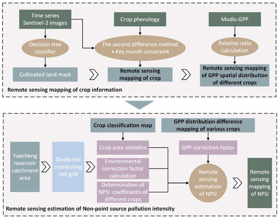 The excessive use of pesticides and fertilizers during agricultural production causes water pollution, which is an important type of non-point source pollution (NSP). Large amounts of harmful substances, such as nitrogen and phosphorus, flow into surface water along with farmland runoff, leading to eutrophication and other problems. However, the pollutant discharge capacity of different types of cultivated land varies greatly. Areas sensitive to NSP are areas with rich crop types, large spatial differences in crop growth, and complex planting patterns. These factors can cause different amounts of fertilizer used in and absorbed by the crops to influence the emission intensity of pollutants. NSP intensity mapping can reflect the spatial distribution of lands’ pollutant discharge capacity and it can provide a basis for pollution control. However, when estimating NSP intensity, existing methods generally treat cultivated land as a category and ignore how complex crop conditions impact pollution intensity. Remote sensing technology enables the classification and monitoring of ground objects, which can provide rich geographical data for NSP intensity mapping. In this study, we used a phenology–GPP (gross primary productivity) method to extract the spatial distribution of crops in the Yuecheng reservoir catchment area from Sentinel-2 remote sensing images and the overall accuracy reached 85%. Moderate resolution imaging spectroradiometer (MODIS) GPP data were used to simulate the spatial distribution of crop growth. Finally, a new model that is more suitable for farmland was obtained by combining this large amount of remote sensing data with existing mapping models. The findings from this study highlight the differences in spatial distributions between total nitrogen and total phosphorous; they also provide the means to improve NSP intensity estimations.