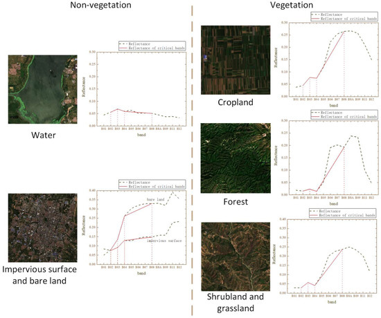 Satellite true-color images of each land use and their corresponding Sentinel-2 spectral curves. The black dotted line indicates the reflectance of all bands of sentinel-2 images. The solid red line represents the reflectance of each land use in red, green, blue, and near-red bands. These four bands are the key bands used in this paper.