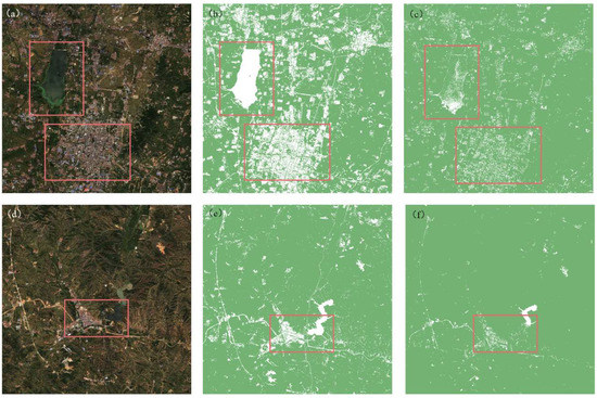 (a,d) are sentinel-2 satellite images displayed in true color. (b,e) are the results of vegetation identification using NDVI. (c,f) are the results of vegetation identification using EVI. Green areas indicate vegetation and white areas indicate non-vegetation. In the red squares are impervious surface and water.