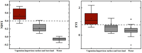 Box diagram of NDVI and EVI indices of typical surface features. Horizontal dashed lines indicate thresholds. The red boxes show the NDVI and EVI values of vegetation. The gray boxes show the NDVI and EVI values of other land use types.