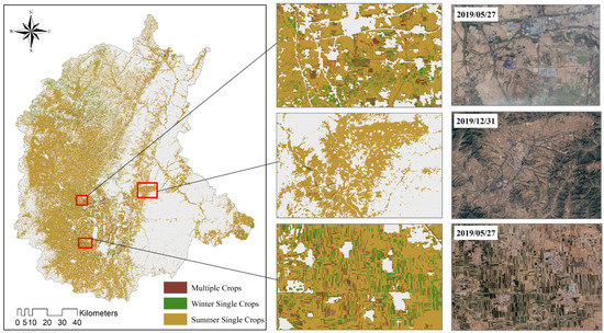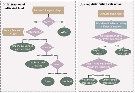 In addition, we collected some crop samples (including multiple crops, winter single crops and summer single crops) from real locations in the field. The corresponding curves of each crop samples were extracted from the time series NDVI image, and the typical curve of each crop was shown in Figure 4b. By analyzing crop phenology information and these typical NDVI curves, we constructed a crop classification method. The crop classification process is shown in Figure 7b. This method consists of two steps: first, crops were classified as either single or multiple crops; second, single crop areas were divided into summer and winter crops.