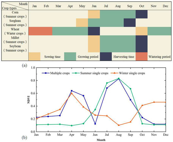 (a) Local main crops and their phenology. It consists of the real data collected from these fields. (b) are the corresponding time series Normalized Difference Vegetation Index (NDVI) curves of each crop samples. There are three types of crops in the study area: multiple crops, winter single crops, and summer single crops. The samples from various locations were collected by field investigation.