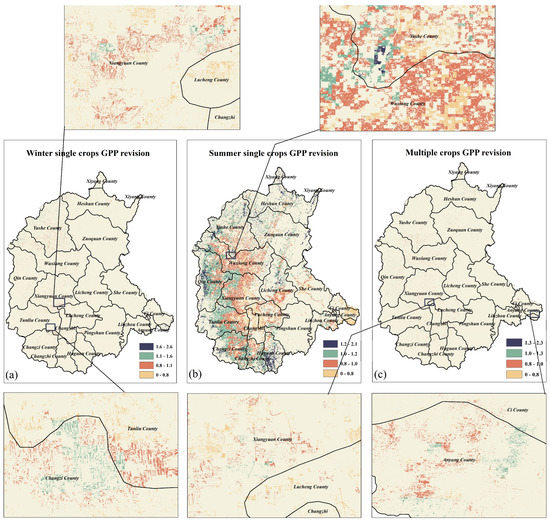 Spatial difference of crop growth in the Yuecheng Reservoir catchment area. (a) Winter single crops GPP revision. (b) Summer single crops GPP revision. (c) Multiple crops GPP revision.