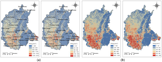 The NSP intensity was estimated for the cultivated land area in the Yuecheng Reservoir catchment area (Figure 12a). The results indicated a concentration area of high source intensity of farmland NSP southwest of the Yuecheng Reservoir catchment area. The NSP intensity decreased gradually to the north and decreased sharply to the east. The overall trend corresponded to the topographic relief, cultivated land area of each county, crop yield, crop environmental conditions, and other factors in the region. The main vein of the Taihang Mountains runs through the middle of the Yuecheng Reservoir catchment area from north to south, and most of the area to the east of the Taihang Mountains is rocky with high mountains and deep valleys, exposed rocks, and little cultivated land. This leads to decreased farmland NSP from the middle to the East. The main factor affecting the gradual reduction of the NSP intensity from south to north in the central and western regions is the crop growth environment. Among these regions, the Changzhi, Lucheng, and Xiangyuan counties are basins with flat terrain and abundant rainfall, which are suitable for crop growth, and multiple crops are mostly concentrated in this area. In addition, the statistical yearbook data indicate that the cultivated land area and fertilization are higher in these counties than in other counties, which makes these counties more likely to serve as sources of pollution.