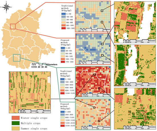 Compared with the NSP intensity estimated using the proposed method shown in Figure 13, the estimations were consistent with the overall trend. But there were considerable differences in the specific estimated quantities of each unit. This is because the method presented in this paper considers crop types and growth. For example, more fertilizer is applied in multiple cropping areas than in single cropping areas, so more NSP is generated. Therefore, the maximum NSP intensity throughout the study area estimated by the proposed method was more than it obtained by the traditional method. Figure 13 shows differences in the estimation of local NSP intensity. It is obvious that there are various types of crops in each 1 km × 1 km grid. Different types of crops lead to different contributions to NSP intensity. All crop types cannot be considered as one category. In addition, when traditional methods are used to estimate TN and TP, the spatial distribution trends of the estimation results will be identical because the NSP intensity coefficients are fixed and interrelated values. Importantly, compared with single crops, the NSP intensity coefficients of TN and TP for multiple crops do not increase by the same magnitude [63]. Therefore, the spatial distribution trends of these values are slightly different, and these differences are not well represented by traditional methods. In general, crop types, growth status, and growth conditions cannot be ignored in NSP intensity estimation and mapping. The method in this paper is a reasonable modification to the traditional method.