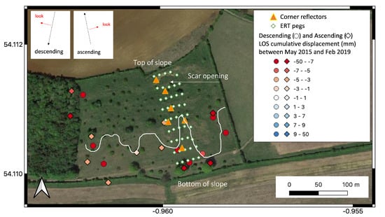 Overview of the Hollin Hill Landslide Observatory. The orange triangles show the locations of the 6 corner reflectors installed in July 2019. The white diamonds show the location of the pegs of the Electrical Resistivity Tomography (ERT) and where GNSS measurements are carried out periodically. The locations shown in this figure are the latest in 2019 before new pegs were installed. Pixels of descending (circles) and ascending (diamonds) InSAR measurements are marked and their colour shows the velocity of that point between May 2015 and February 2019 with reference to a nearby stable area. Both ascending and descending measurements are referenced to the same area. The white line marks the extent of the flow lobes.