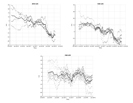 Line of sight (LOS) displacement time series of the pixels shown in Figure 2 measured in the following frames: 081D descending (top left), 154D descending (top right) and 132A ascending (bottom) frame. The dots show individual time series and the line is their average.