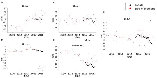 Comparisons between the motion of individual pegs and the closest InSAR pixel in the line-of-sight direction. These InSAR pixels correspond to the southern part of the slope where the flow lobes are located. Both time series show relative movement compared to the first date of InSAR acquisition. The InSAR data are extracted from ascending track 132A (a,b), descending track 081D (c,d) and descending track 154D (e).
