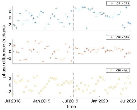 Stabilisation of phase differences after the installation of the corner reflectors. The vertical line shows the time of installation. The top and middle graphs show phase differences between two corner reflectors, and the bottom panel is the phase difference between the location of a corner reflector and a random point on the field.