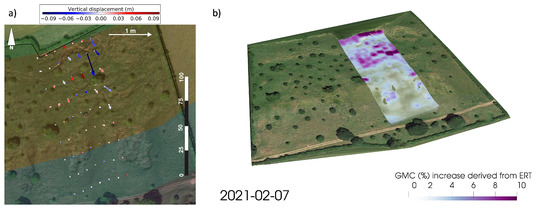 (a) Motion of the pegs during the January 2021 event (between 18 November 2020 and 19 February 2021). (b) Moisture increase derived from Electrical Resistivity Tomography (ERT) during the 2021 January event.