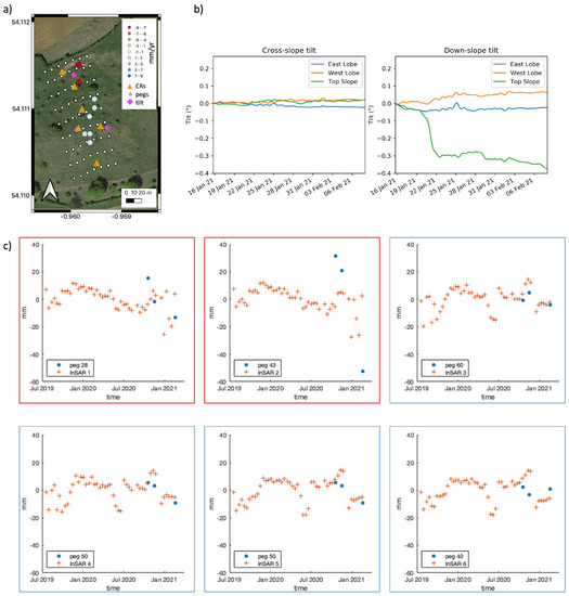 (a) InSAR velocities derived from ascending acquisitions since the installation of the 6 corner reflectors in July 2019. Coloured circles show the location and velocities of coherent pixels. These correspond to signals from the corner reflectors. Orange triangles show the location of corner reflectors, white dots show the location of new pegs placed on the ground in 2020 and magenta diamonds show the locations of the three tiltmeters installed in January 2021. (b) Time series of the tiltmeters installed in mid-January 2021. Left and right panels show cross-slope and down-slope tilt in degrees, respectively. (c) Individual InSAR time series (orange +) compared to movements of the closest peg in the ascending InSAR line-of-sight direction (blue circles). Time series corresponding to the 2 northern (velocities marked with red) points are shown in the red boxes, while examples of the pixels from the lower parts of the slope are shown in the blue boxes. InSAR points are marked from north to south, and the plotted pegs are of the location closest to the corresponding InSAR point.