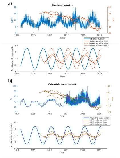 For the 2012/2013 event, observations of gravimetric moisture content show that during this period of unusually high rainfall and the reactivation of the landslide, the usual seasonal behaviour of the landslide changed [11]. We compared the ground-based measurements of absolute humidity and Volumetric Water Content (VWC) to the InSAR time series (top panels of Figure 10) and expanded on work done previously by comparing SAR and VWC [43]. Volumetric water content is the ratio of water volume to soil volume and it has been measured at the Hollin Hill site since March 2014 with the COSMOS system at a depth between 15 and 40 cm [44].