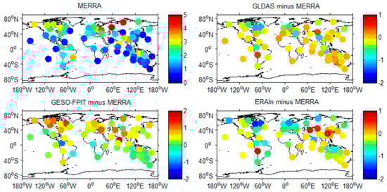 RMS of displacements (in units of mm) predicted by different hydrology models in the up component for 70 GPS stations from January 2001 to December 2014. MERRA was taken as a reference to distinguish the RMS differences of the four hydrology models more clearly.