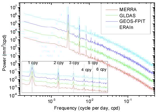 We used four different publicly available loading models: (1) HYLD (soil-moisture and snow) estimated from the European Centre for Medium-Range Weather Forecasts (ECMWF) Reanalysis (ERA interim) model [] (6 h, 0.7° × 0.7°), (2) HYLD (soil-moisture, snow, and canopy water) estimated from the Global Land Assimilation Data System/National Centers for Environmental Prediction, Oregon State University, Air Force, and Hydrology Research Laboratory (GLDAS/Noah) model [] (3 h, 0.25° × 0.25°), (3) HYLD (soil-moisture, snow, and canopy) estimated from the Goddard Earth Observing System—Forward Processing for Instrument Teams (GEOS-FPIT) model [] (1 h, 0.5° × 0.625°), and (4) HYLD (soil-moisture, snow, and canopy water) estimated from the Modern-Era Retrospective Analysis for Research and Applications (MERRA) model [] (1 h, 1/2° × 2/3°). Table 1 gives all the HYDL models characteristics to improve the clarity and the comparison. Due to a much coarser resolution and being less effective on correcting GPS data [,], HYLD estimated from the National Centers for Environmental Prediction (NCEP) reanalysis model [] (1.875° × 1.875°, 24 h) was tentatively not considered in the current research. For ERAIn-HYDL and GLDAS-HYDL, we directly used the displacements available on École et Observatoire des Sciences de la Terre/Institut de Physique du Globe de Strasbourg (EOST/IPGS) loading service (http://loading.u-strasbg.fr/, accessed on 30 December 2020). For MERRA-HYDL and GEOS-FPIT-HYDL, we used the outputs from the mass loading computation software (MALO) available on the International Mass Loading Service (http://massloading.net/, accessed on 30 December 2020) []. We noted that these four HYLD models have different environmental input data, but their computation strategies are mostly the same. Permanent ice-covered regions (Greenland, Alaska, mountain glaciers, etc.) were masked out. The conservation of the total water mass was enforced by adding/removing a uniform oceanic layer, compensating any lack/excess of water over land. To facilitate the comparison with GPS data, Green’s functions [] were all computed in the center of Earth’s figure (CF) frame using the load Love numbers (LLNs) estimated from the preliminary reference Earth model (PREM) [].