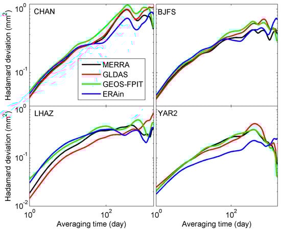 Overlapping Hadamard variance of hydrology loading predictions (variation fits near 1, 2, 3, and 4 cpy were removed) at the sites of CHAN, BJFS, LHAZ, and YAR2. Error bars of Hadamard variance were omitted for clarity.