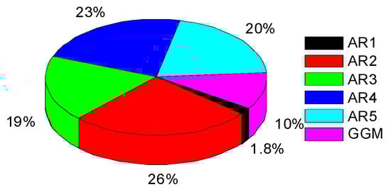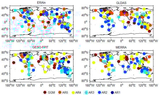 Noise model scatter of the four hydrology loading predictions at 70 GPS stations for the up component with the lowest Akaike Information Criterion (AIC). AR(p) = autoregressive noise with an order of p, and GGM = Generalized Gauss Markov noise.