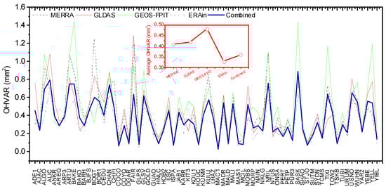 Mean overlapping Hadamard variance (OHVAR) of different hydrology loading predictions and their combinations. The averaged OHVARs of 70 GPS sites were provided and inserted in the figure.