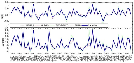 On the other hand, we made an additional comparison of the HYLD predictions with the GPS height observations. Here, we used the JPL/SOPAC combined GPS daily solutions, publicly available from the Scripps Orbit and Permanent Array Center and California Spatial Reference Center (SOPAC and CSRC) Garner GPS Archive (ftp://garner.ucsd.edu/pub/timeseries/, accessed on 30 December 2020). These daily GPS products are clean (outliers removed) and free of offset and linear trends. Solid Earth tides, polar tide, ocean tidal loading, and Earth rotation were applied in the primary GPS processing, whereas non-tidal loading (e.g., atmospheric and hydrological loading) were not yet taken into account, and they exist in the residual time series as discussed in this study. Popular indices of quantifying the accuracy of the hydrological models, such as the Nash-Sutcliffe Efficiency (NSE) [] and Weighted RMS reduction ratio in percent (WRMS%) [,], were used to indicate how well our HYLD predictions fit the GPS observations (see Figure 7). For clarity, we subtracted the non-tidal atmospheric pressure loading (ATML) and non-tidal ocean loading (NTOL) from the daily GPS time series to allow for a direct comparison with the hydrological loading. Readers should bear in mind that, currently, the uncertainties of ATML and NTOL modeling are unknown. By comparing MERRA with other updated reanalyses (e.g., ERA-Interim), advances made in this new generation of reanalyses, and archives much of the model output [,], we tentatively used the ATML from MERRA (6 h, 1/2° × 2/3°), which is calculated from the International Mass Loading Service. We also adopted the NTOL from the global Estimating the Circulation and Climate of the Oceans (ECCO) [] (12 h, about 1 degree), which were download from the EOST/IPGS loading service. The results showed that the NSE values between the GPS and HYLD were 0.09, 0.09, 0.08, 0.09, and 0.07 for the combined-HYLD, MERRA-HYLD, GLDAS-HYLD, GEOS-FPIT-HYLD, and ERAIN-HYLD, respectively. We also found that 56, 54, 53, 51, and 57 out of 70 GPS sites had their WRMS reduced for the combined-HYLD, MERRA-HYLD, GLDAS-HYLD, GEOS-FPIT-HYLD, and ERAIN-HYLD, respectively. Their averaged WRMS% reductions were 6.85%, 6.86%, 6.07%, 6.89%, and 5.23%, respectively. The results revealed that the combined-HYLD obtained more information than can be derived from a single model.