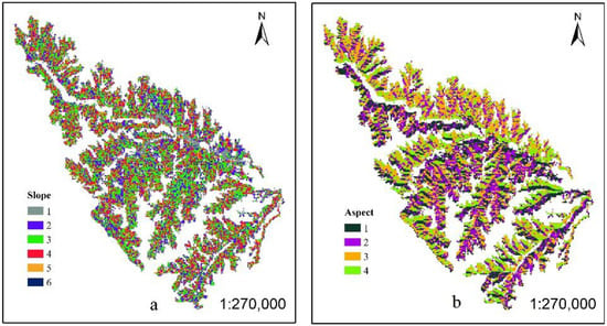 (a) Slope classes, where 1–6 represent 0–5°, 6–15°, 16–25°, 26–35°, 36–45° and ≥46°, respectively. (b) Aspect classes, where 1–4 represent shaded (315–45°), semi-shady (45–90°, 270–315°), semi-sunny (90–135°, 225–270°) and sunny (135–225°), respectively.
