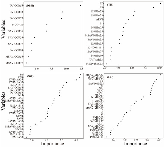 We obtained explanatory variables related to the dependent variables by the Boruta algorithm, as shown in Figure 5. The number of texture variables was more than that of spectral variables among the variables we obtained. The spectral variables b2 and b4 had the highest importance values relevant to TH and SW, respectively. The texture variables MSAVIMEA3×3 and DVICOR5×5 had the highest importance values relevant to CC and DBH, respectively.