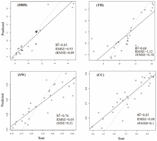 Validation of field-test and predicted DBH, TH, CC and SW by the random forest regression models.