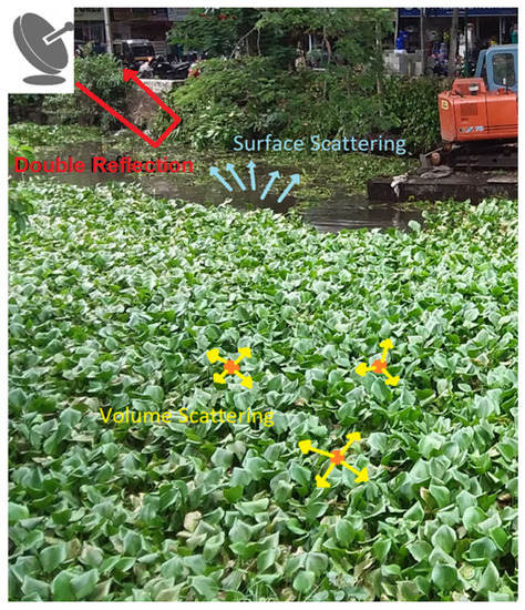 where Ib is backscatter, Iw is the scattering from water, Ih is scattering from the plant and Id is double reflection. σh is the roughness of the hyacinth and σw is the roughness of the water. Finally, εh and εw are the dielectric constant of hyacinth and water, respectively. The smoother the water is, the smaller Iw will be, and Id will be higher. The greener and thicker the plant is, the higher the Ih value will be.
