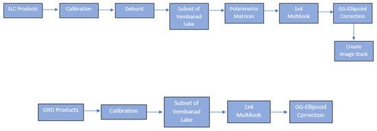 Sentinel-1 SLC images were processed (Figure 2) in the Sentinel Application Platform (SNAP). These images were calibrated and debursted before a subset of Vembanad Lake was created and polarimetric matrices were established with a 1 × 4 multilook used to reduce noise.