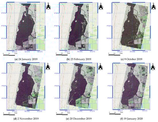 Courtesy of the European Space Agency (ESA) Copernicus programme, dual-polarimetric Sentinel-1 SAR data were obtained. The mode of acquisition is Interferometric Wide Swath (IW), Ground Range Detected (GRD) and Interferometric Wide Swath Single Look Complex (SLC). The spatial resolution of the SAR images is approximately 20 × 20 m (for GRD) or 20 × 5 (for SLC) with a temporal resolution of up to 6 days on Vembanad Lake (12 days using a single orbit). A total of 46 images were acquired from January 2019–January 2021, consisting of 11 GRD acquisitions for single image analysis and 46 SLC acquisitions for change detection analysis.